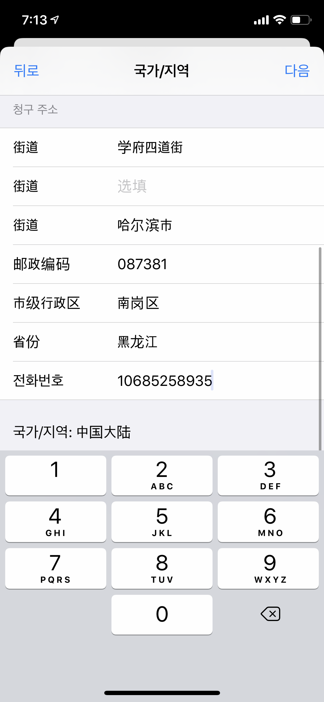 중국 내 거주주소가 없기 때문에